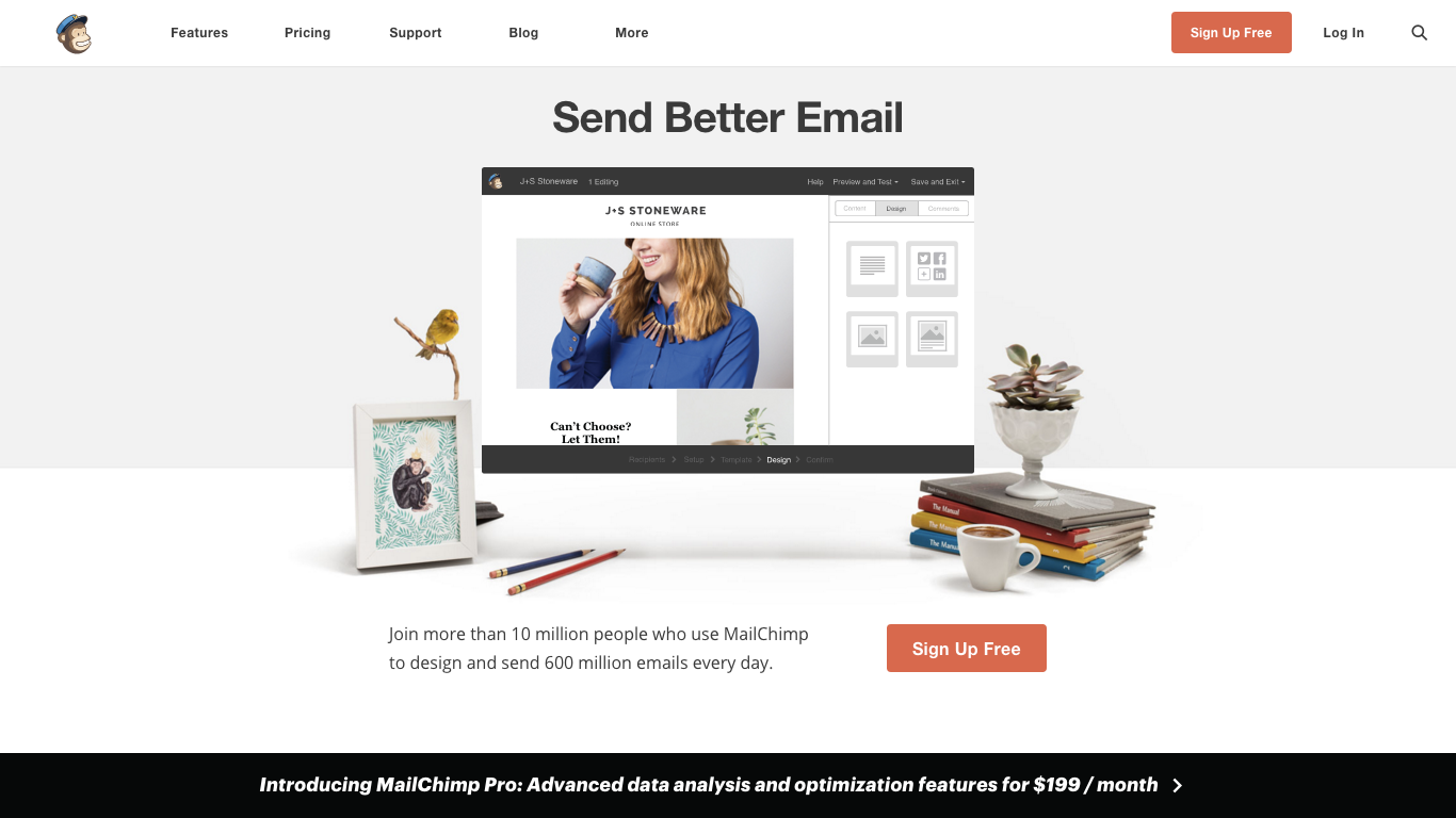 Take a look at the MailChimp homepage. A line divides the menu at the top (a.k.a. the navigation bar) from the central focus of the page. Under the main section, we've got another line introducing Mailchimp Pro. This linear layout makes it easy for the visitor to understand exactly what's going on.